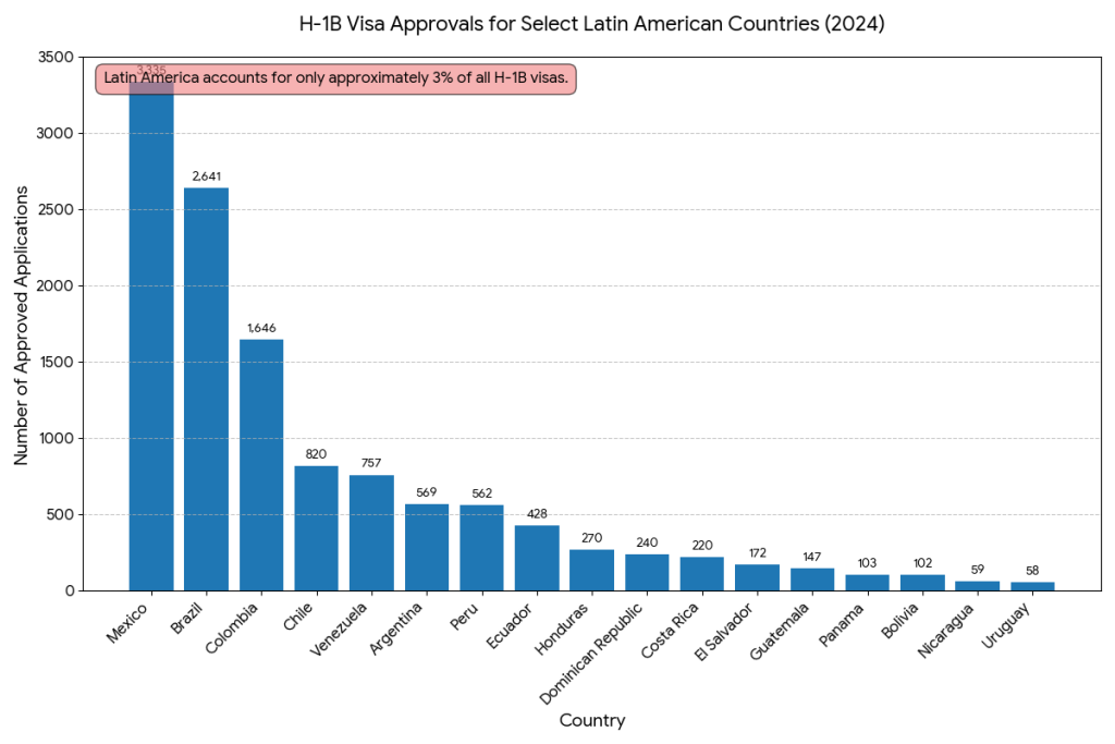 Still, Latin America’s share of U.S. visa approvals is tiny — just 3% of all H-1B approvals in fiscal 2024. Mexicans received 3,335 visas, Brazilians 2,641, and Colombians 1,646, according to data from U.S. Citizenship and Immigration Services (USCIS).