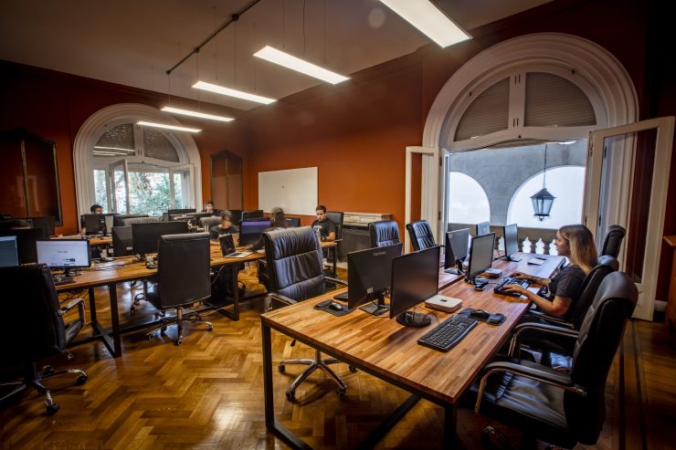 Combining these two concepts — colonial era environment with modern tech — provides its own complexities in terms of decor. “Nothing would suit us better than a Steampunk style, combining luxury and sophistication of the old mansion with the innovation and futurism of the team,” said Codigo del Sur’s Carla Martinovic. This is reflected in the combination of fine leather Chesterfield sofas and a grand piano, along with video art pieces emulating supercomputers from a post-apocalyptic future. “Such combination makes visitors, as well as the team, feel like they’re entering a surreal world of sophistication and technology worthy of a post-apocalyptic movie,” she said.